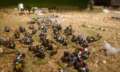 The Blues and St. Andrews cavalry are brigaded with one cannon and a mitrailleuse and are (again) dispatched to go round the southern flank of the southernmost heights, with instructions to demonstrate against the enemy's right flank.