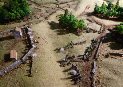 Over on the far right the British Indians and Rangers engage in a prolonged, long range firefight with the militia units below Mary's Vineyard. Nothing decisive occurs, but one militia regiment slowly has its resolve whittled away, as casualties and the effect of being fired upon from two sides, begin to have an effect. To try to deal with this, two American regiments are dispatched to take the Vineyard. They move round to the gentler incline, mount the slopes, fire a volley and charge the walls.